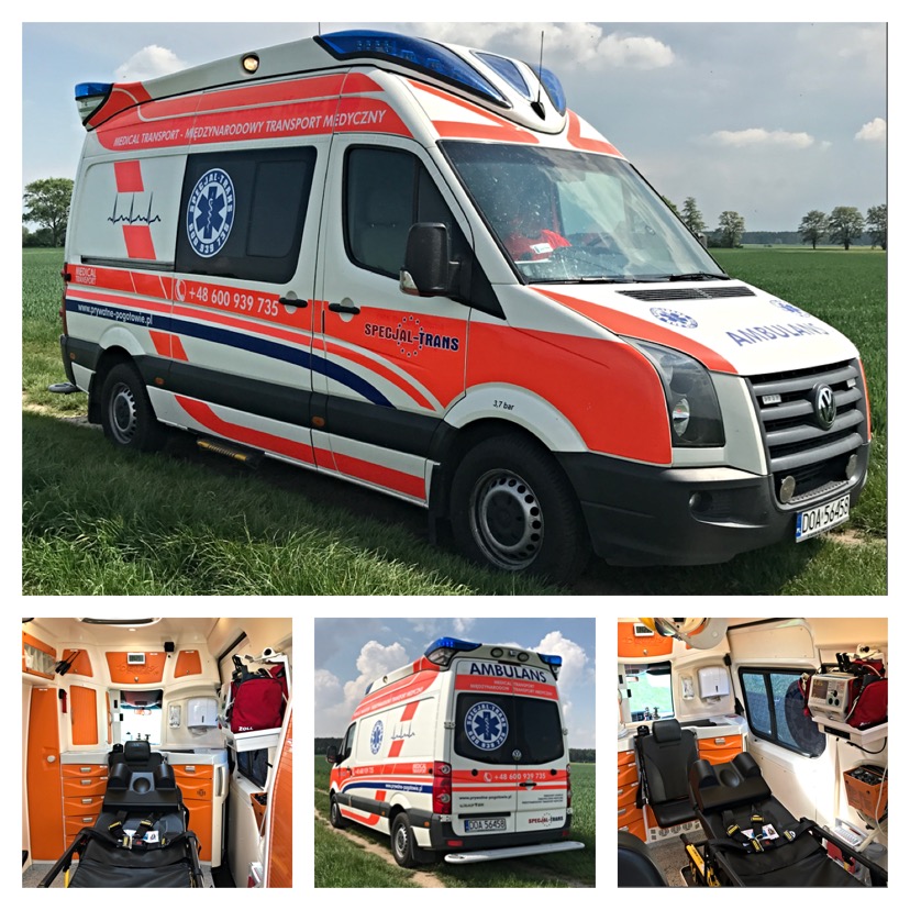 Ambulans przystosowany do pracy w transporcie międzynarodowym. Do transportu wykorzystujemy najlepsze na świecie, wygodne nosze STRYKER M1. W ambulansie zapewniamy wyposażenie pozwalające na monitorowanie pacjenta, prowadzenie farmakoterapii czy tlenoterapii.